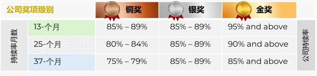 以往的代理奖项主要关注前线代理的专业操守和服务水平,而 AQBA 公司奖则把焦点放在保险公司整体表现。该奖项根据保单在 第13个月、第25个月及第37个月的持续率进行评估,这些指标广泛被视为反映公司是否提供合适产品、是否赢得客户信任,以及是否具备良好管理和稳健经营能力的重要参考。